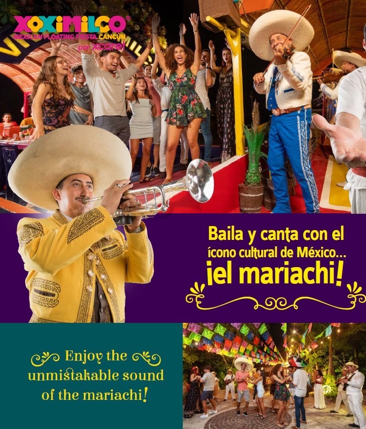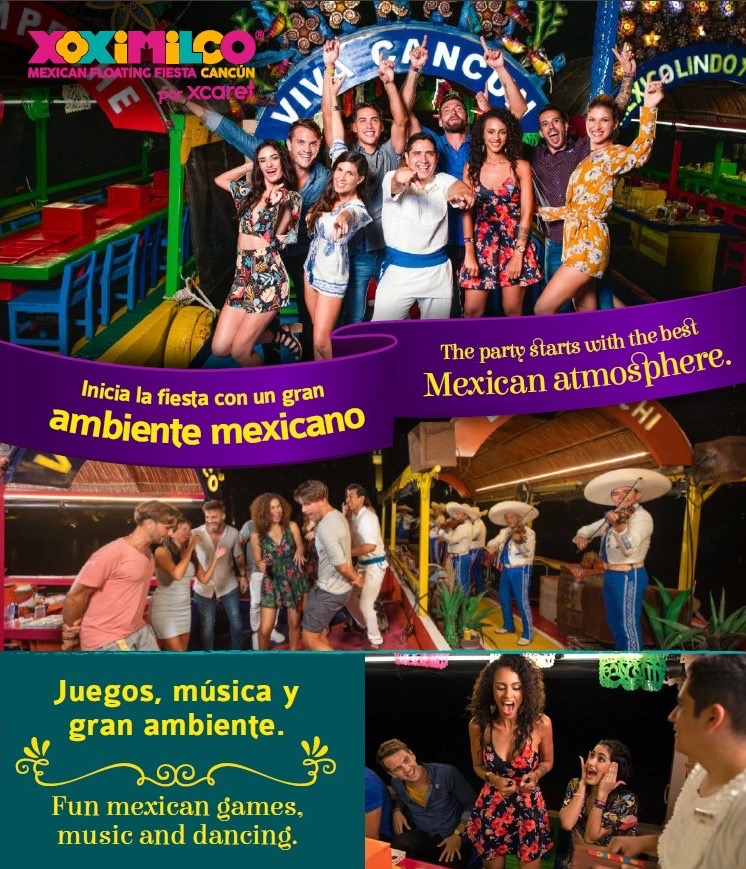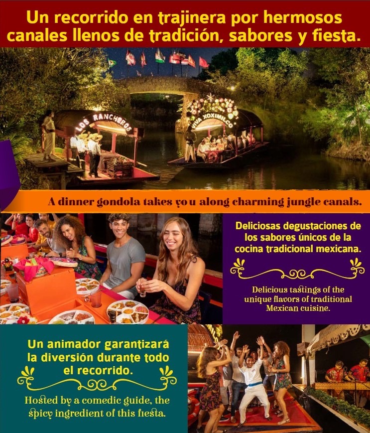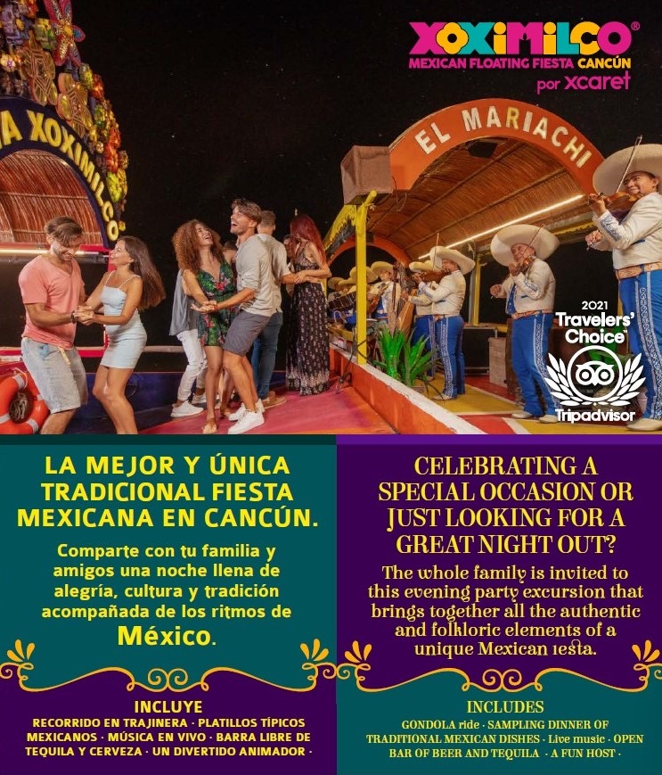 Xoximilco es de principio a fin la mejor y más tradicional fiesta mexicana en Cancún, en donde no puede faltar la comida, el tequila, el mariachi, rodeados de la mayor diversidad de elementos culturales y tradicionales representativos del país. Se disfruta de exquisitos sabores de nuestra gastronomía acompañado de música en vivo, baile, risas y un animador que amenizará esta fiesta que parece no terminar (guateque, festejo). Brinda, baila y canta con ritmos de todo México y vive una noche llena de alegría, cultura y Se aborda una pintoresca trajinera (capacidad 20 pax) que lleva a recorrer los canales de Xoximilco Cancún acompañado por un animador que hace reír y bailar durante todo el recorrido. Mientras sigue la fiesta escuchando en vivo al mariachi, bailando con la banda norteña y disfrutando de una cena con lo mejor de la cocina mexicana presentada en diferentes platillos. GRUPOS MUSICALES Mariachi Banda de pueblo Marimba Jarana Agrupación norteña Grupo Ranche